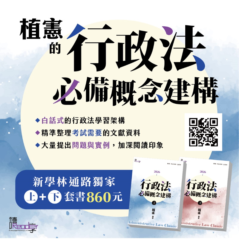 請注意,本套書為預購商品,預計於8月底《行政法必備概念建構(下)(9版)》出版後,依訂單順序陸續出貨,不會先寄《行政法必備概念建構(上)(9版)》。