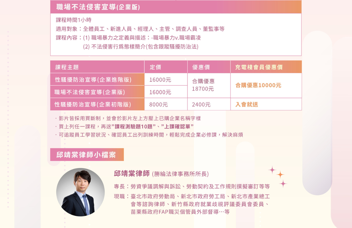 因應2024年3月8日「性別平等工作法」新修法上路,勝綸團隊受事業單位廣邀內訓、參與案件調查與公司法遵制度建置等,可見事業單位對於新法上路後的法遵規劃與調查執行方式都有迫切需求。鑑此,勝綸彙整過往豐碩的實務案例經驗包含個案諮詢、專案輔導與協處調查等各類案例後,開設【職災不法侵害宣導(企業版)】,以降低雇主責任與管理風險。