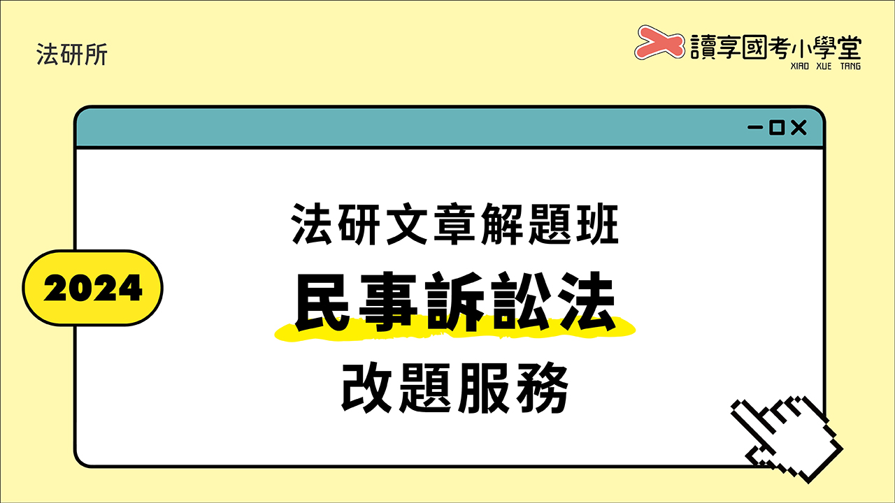 若您為2024年法研文章解題班課程學員,欲事後加購改題服務者,請優先聯繫您的購買通路或是客服協助加購,並且一併協助您確認是否仍有改題名額,以確保您的權益。