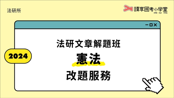 若您為2024年法研文章解題班課程學員,欲事後加購改題服務者,請優先聯繫您的購買通路或是客服協助加購,並且一併協助您確認是否仍有改題名額,以確保您的權益。