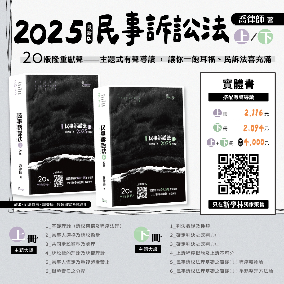 本次修正,除了增添了迄2025年3月之學說論述、國家考試及研究所考試試題,並且修正、調整了一些瑣碎過時的部分外,最大的變革是筆者決定另外以有聲的方式,就本書中的一些重要議題作解說,幫助各位同學可以更快的理解民事訴訟法上一些基本概念,也因為是初次嘗試,所以我們先簡單在上、下冊各挑幾個主題進行,之後若有必要再作篇幅及深度的延伸及優化,請舊雨新知不吝賜教。