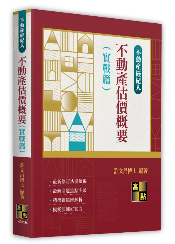 不動產估價是不動產從業人員必備之專業知識,本科命題焦點以內政部發布之「不動產估價技術規則」為主,該規則雖然條文不多,但每一條都是重點。由於不動產估價有其理論方法,並著重實務應用,因而初學者較不易入門。作者講授「不動產估價」及實際從事估價工作多年,以教學心得與實務經驗整理成書,希望有助於估價知識之推廣,有效提升學生之應考實力。作者另著有「不動產估價概要(基礎篇)」,讀者亦可搭配使用,以有效提升應考實力。 本書內容深淺適中,其特點有三: