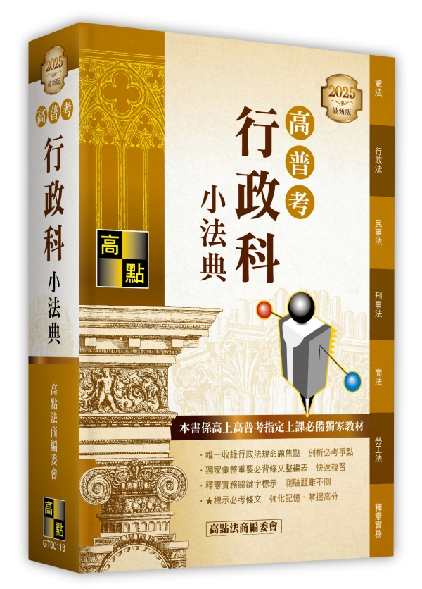 法院組織法、中央行政機關組織基準法、行政院組織法、憲法訴訟法、立法院職權行使法、公職人員選舉罷免法、地方制度法、道路交通管理處罰條例、所得稅法、土地法、財政收支劃分法、中華民國刑法、刑事訴訟法、勞動基準法、就業服務法……等。是目前坊間同款小法典中收錄法規最新、最齊全者。