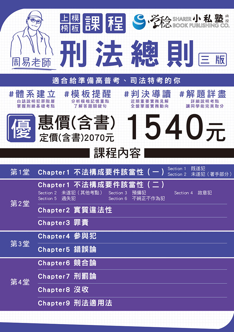 本課程含書籍《上榜模板刑法總則(3版)》、及補充講義